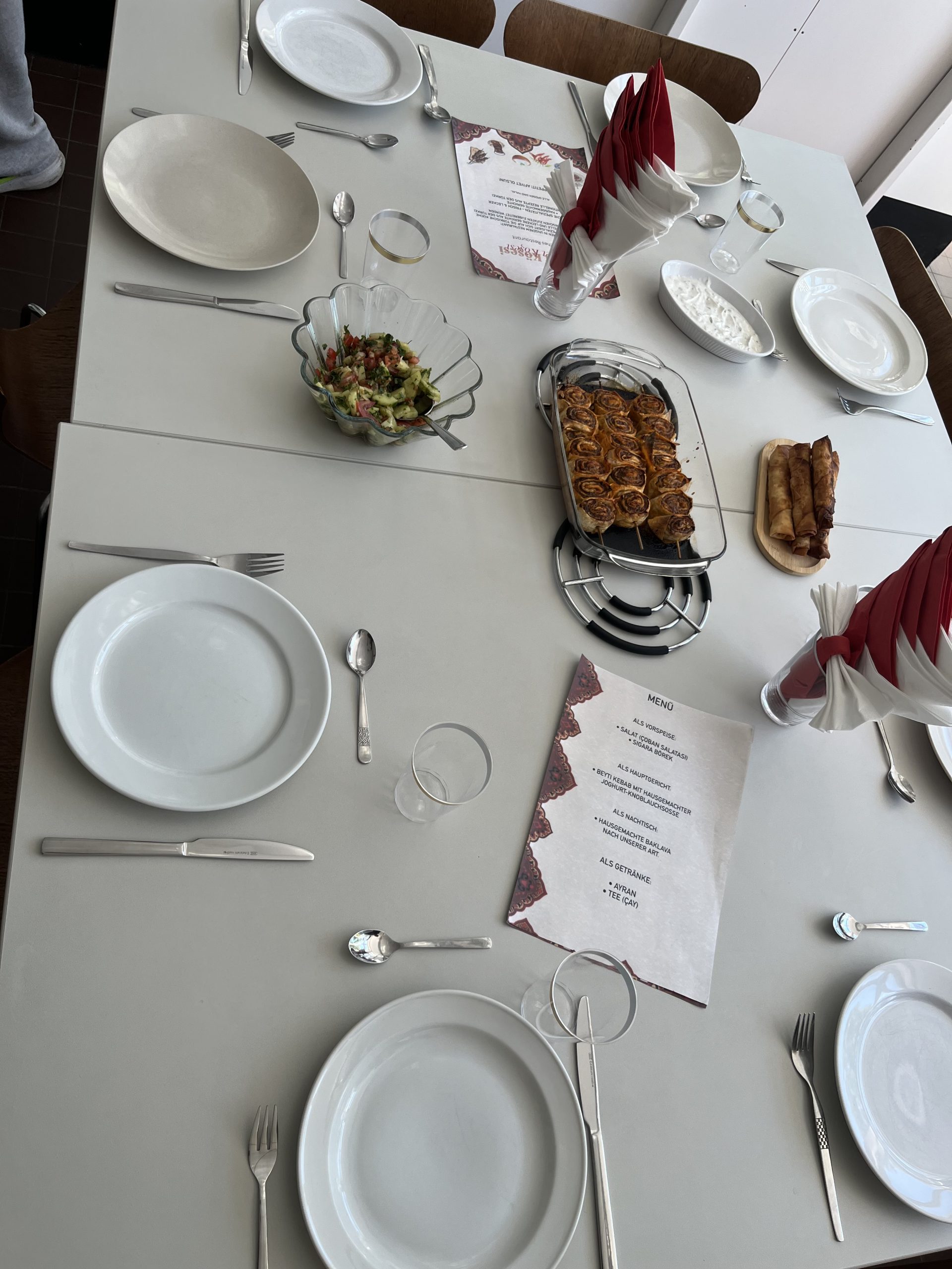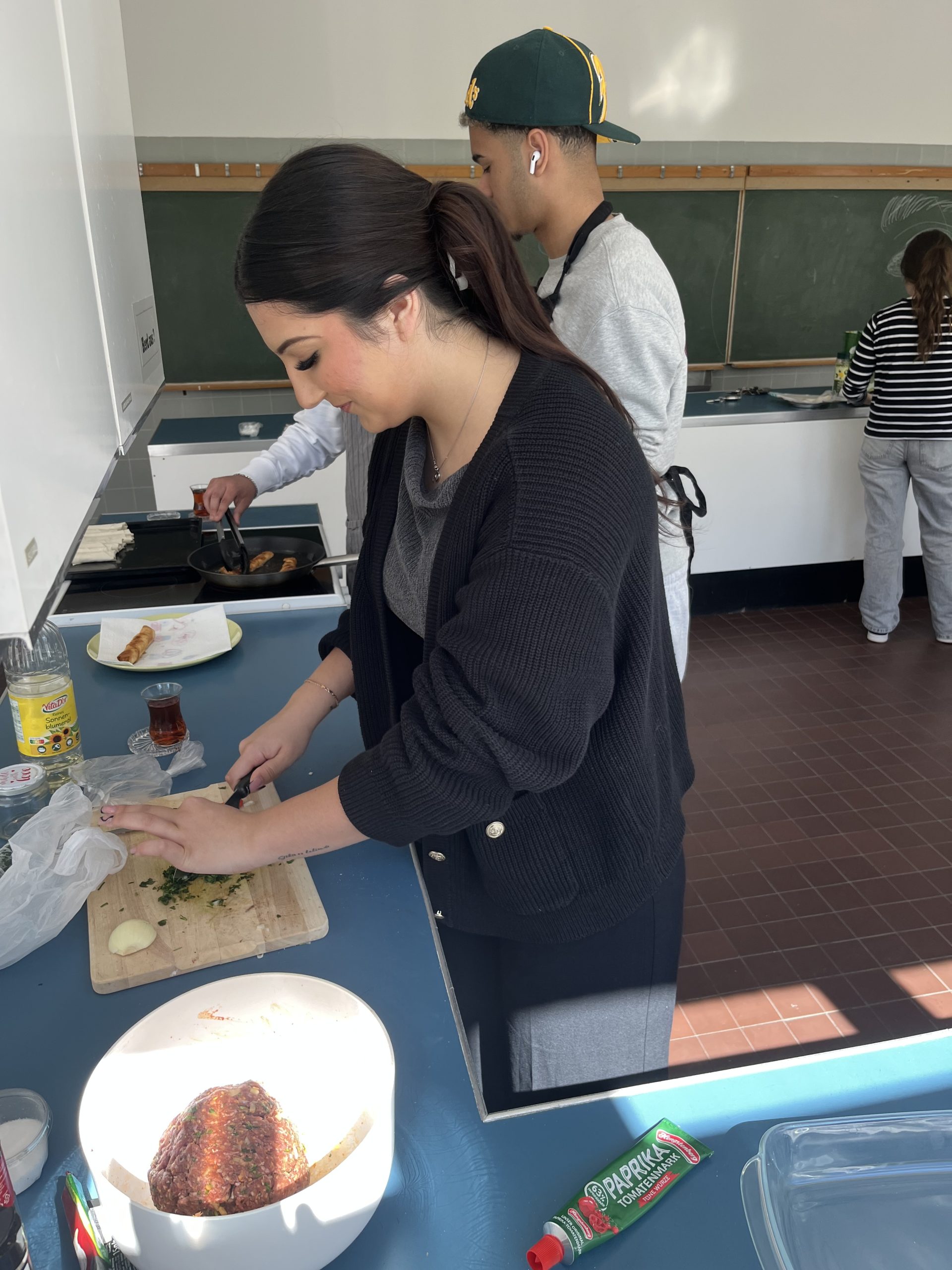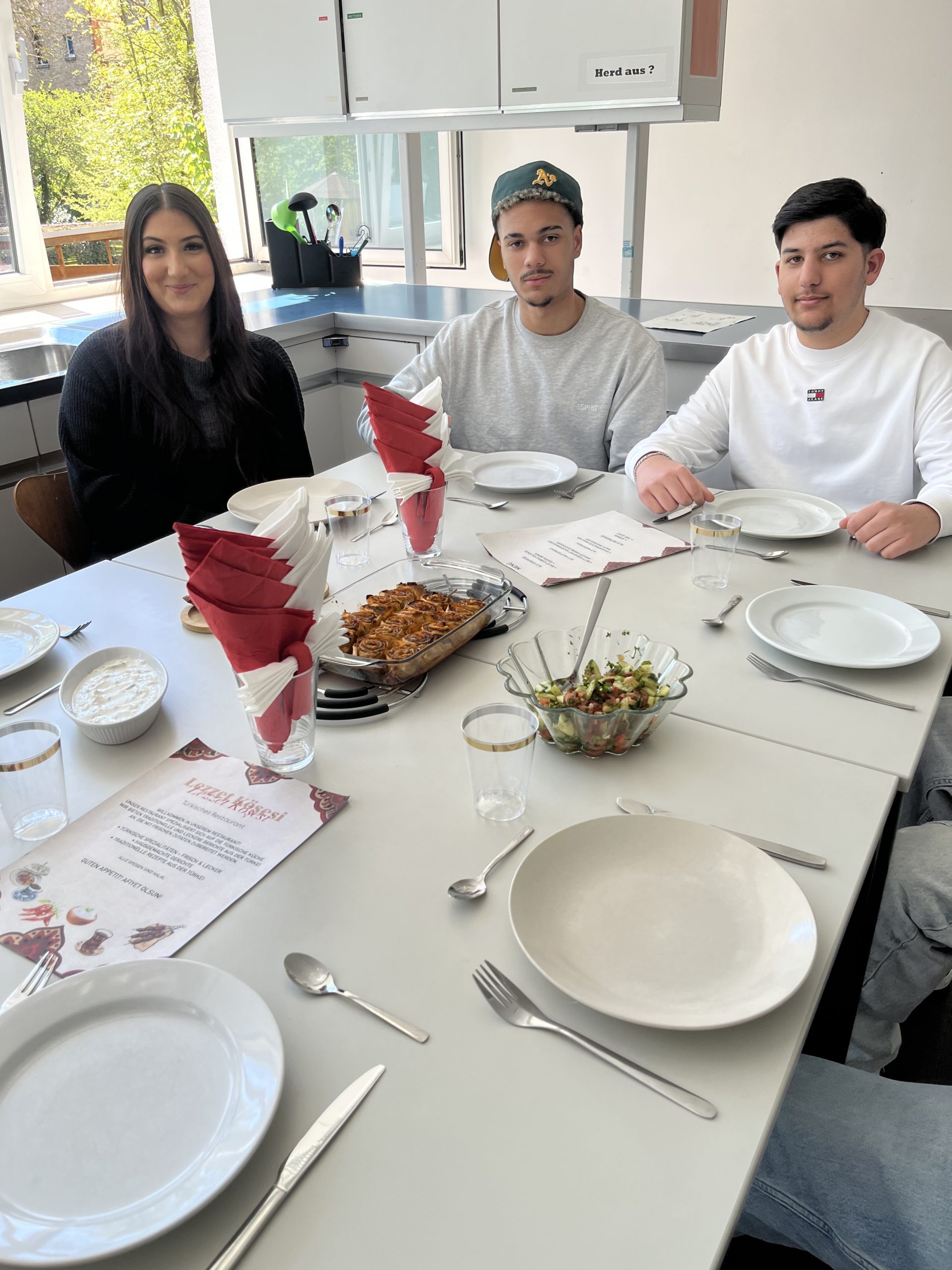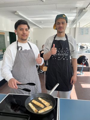 Eine Schülergruppe des Jahrgangs 10 hat ein 3 Gängemenü liebevoll zubereitet. Das Abschlusskochen ist ein besonderer Moment und Bestandteil des Profils Gesundheit und Soziales. Beim Kochen geht es nicht nur um das Kochen selbst, sondern auch um Planung, Teamarbeit, Hygiene und Präsentation der Speisen. Es ist eine gute Möglichkeit, Verantwortung zu übernehmen und gleichzeitig neue kulturelle Gerichte kennenzulernen.